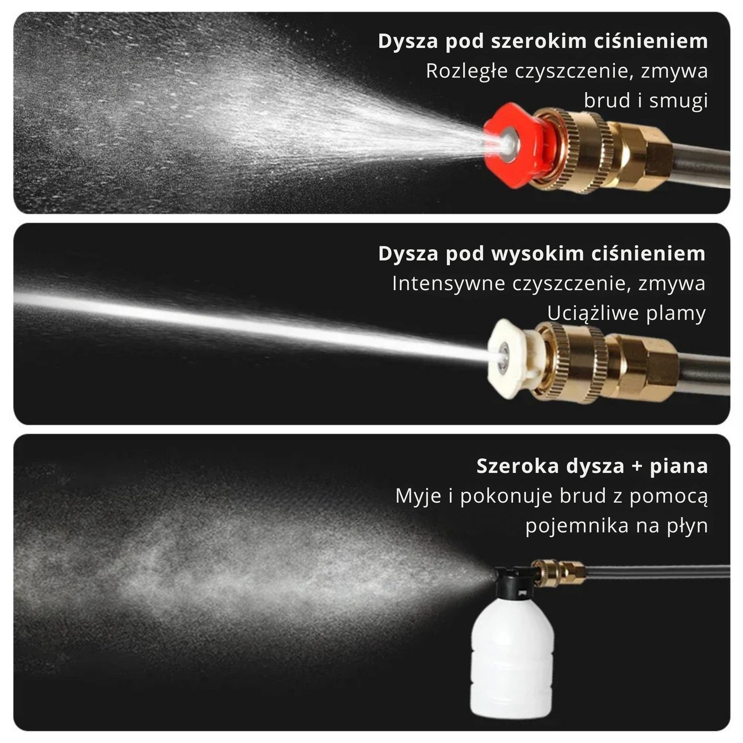 W skład zestawu wchodzi: Myjka ciśnieniowa, Bateria, 3 różne końcówki, przewód, filtr do wody, ładowarka, opakowanie.